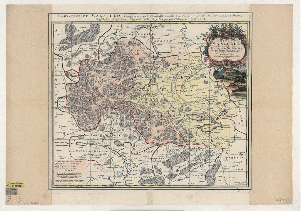 Die Grafschaft Mansfeld im Jahr 1750: Schon damals war die Region von einem dichten Netz aus Bergbauaktivitäten geprägt, deren Folgen uns bis heute beschäftigen. Karte der Grafschaft Mansfeld, ca. 1:110 000, Kupferstich, 1750 : Comitatvs Mansfeld : prout ille iuris hodie Saxonico-Electoralis et Magdeburgici, atque adeo secundum statum novissimum se habet, geographice ab anonymo delineatus ; C. P. S. C. M. = Die Grafschaft Mansfeld königl. preuß. und churfürstl. sächsischen Antheils / Ad normam legitimae designationis reductus a Tob. Maiero. – [Ca. 110 000]#1:110000. – [Nürnberg] : Homanniani Heredes , 1750. – 1 Kt. : Kupferst. ; 52 x 44 cm | Digitalisierung: SLUB Dresden | Datenpartner: Deutsche Fotothek | Lizenz: http://creativecommons.org/publicdomain/mark/1.0/ | URL: https://www.deutsche-digitale-bibliothek.de/item/DYFBCS4W5HT3YI6G65OIVNSSOQXYJEFO